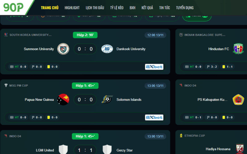 Để sử dụng tính năng livescore siêu tốc trên 90PTV, người dùng chỉ cần truy cập vào website chính thức của nền tảng. Tại giao diện chính, các trận đấu đang diễn ra sẽ được hiển thị nổi bật theo từng giải đấu.
