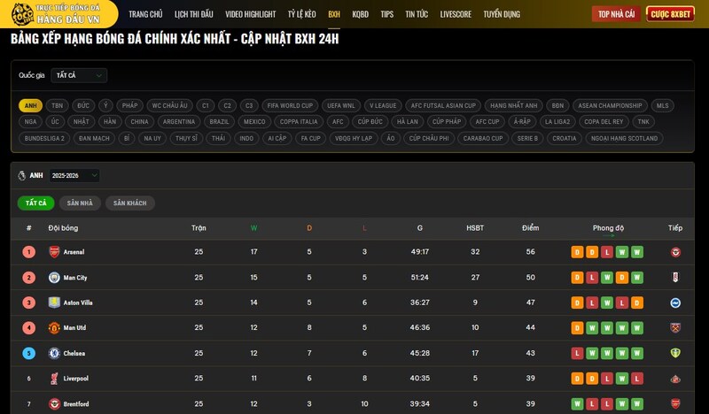 - Thứ hạng, điểm số, hiệu số hiển thị rõ ràng.